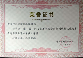 近日,第四届全国报刊编校技能大赛青海赛区初赛评选中,《青海师范大学学报》编辑部荣获优秀组织单位奖,两名编辑梁霞、张茜荣获个人三等奖。