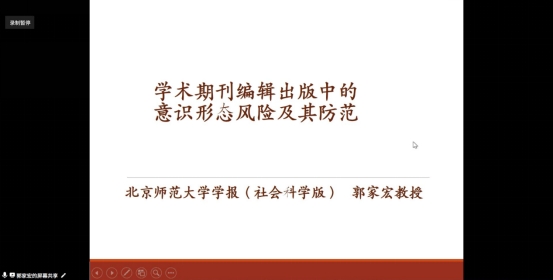 为进一步落实意识形态工作责任制,提升期刊编辑人员意识形态工作能力,10月28日,我校学报编辑部邀请《北京师范大学学报(社会科学版)》执行主编郭家宏教授作了题为《学术期刊编辑出版中的意识形态风险及其防范》的线上专题报告,学报编辑部全体编辑听取了报告。报告会由学报编辑部副主任梁霞主持。